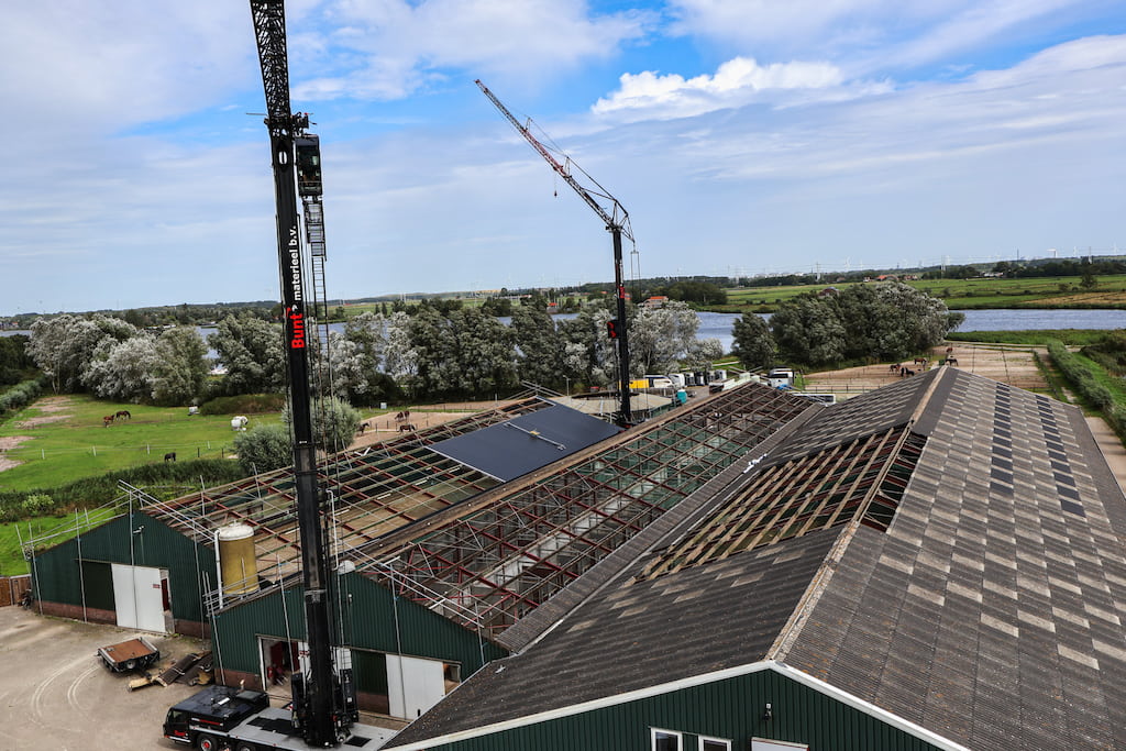 Bij Ruitersportcentrum Schoteroog hebben we een dakrenovatie uitgevoerd. Bunt Asbestsanering heeft 6000 m² asbestvrije golfplaten verwijderd. Wij zijn tegelijkertijd begonnen met het leggen van het nieuwe dak. We hebben trapezium sandwichpanelen gemonteerd. Vervolgens heeft Bunt Lichtstraten lichtstraten geplaatst op alle daken.